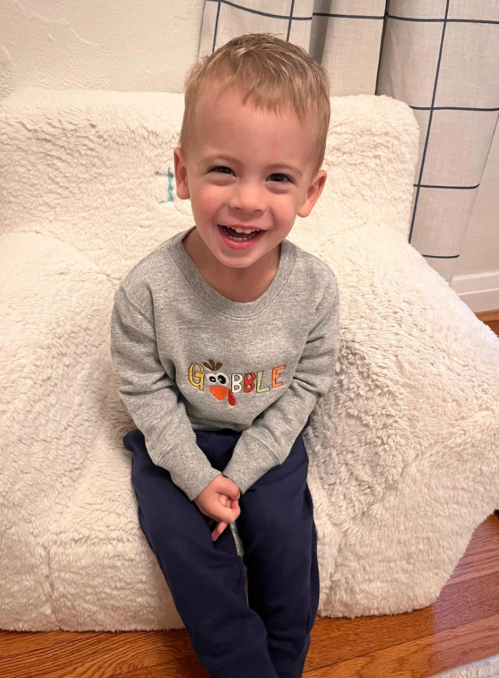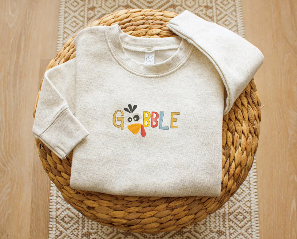 Come to the party on Thanksgiving with this cute Gobble toddler sweatshirt. You decide on sweatshirt color, and we will blend the design with fall colors to complement your sweatshirt color. Sweatshirts runs true to size. Photo shows natural tweed sweatshirt.